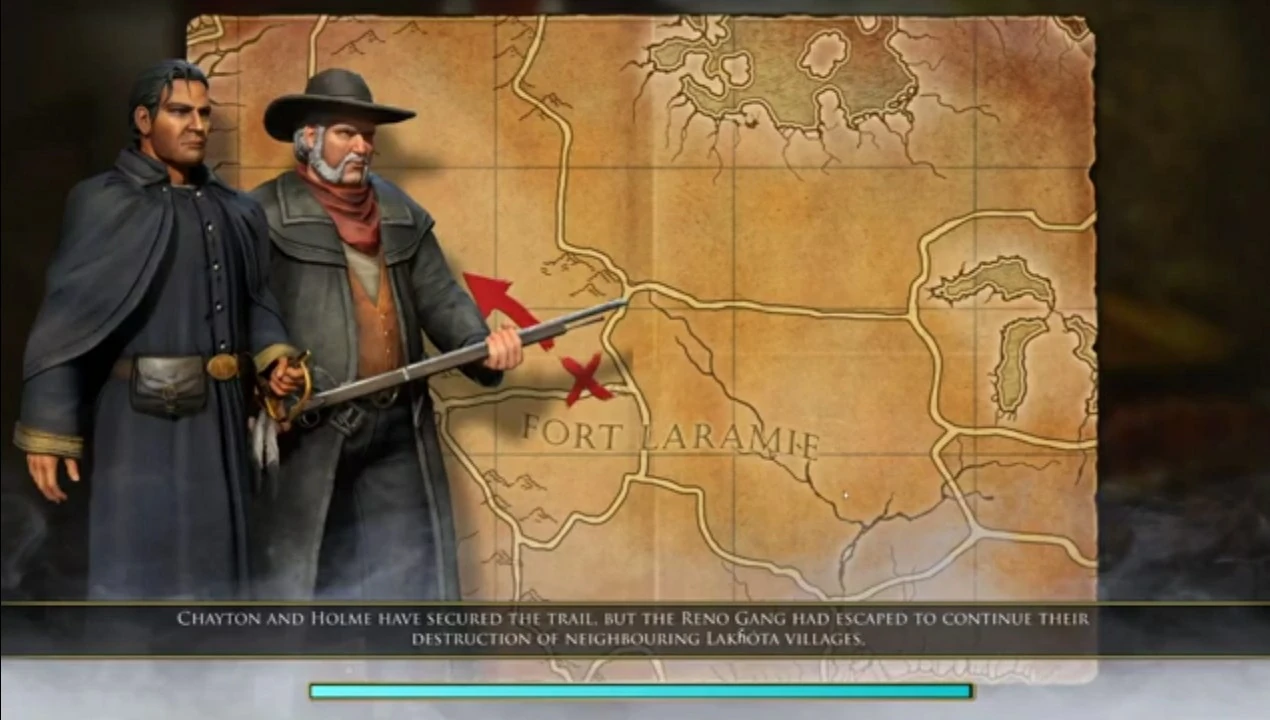 The player can begin by sending Black and Holme up north along the trade route to scout the map for treasures and enemy units. As Black and Holme head up north they will arrive upon a Saloon guarded by 2 enemy Renegados. Using Chayton's Hawk Eye ability, the player can snipe down one of the Renegado before finishing off the second promptly. At the same time 3 Railroad Workers attacked by an enemy Axe Rider will scramble in from Northwest and towards Black and Holme. The player can use Chayton's other crack-shot ability, Eagle Eye to take down the Axe Rider and save the workers.