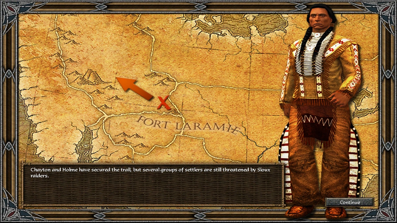 Players start out in the map, and engage in a short skirmish with Red Cloud's forces attacking 2 Railroad Workers. After driving away the forces, the player is provided with their first objective of saving 20 Railroad Workers. The player is at this point also provided with a friendly settlement consisting of a Bank, Community Plaza, several Houses, and a 3 Outposts. A trade route will cut through the settlement, leaving outposts and buildings on both halves. The player will also be gifted with several free Cows.