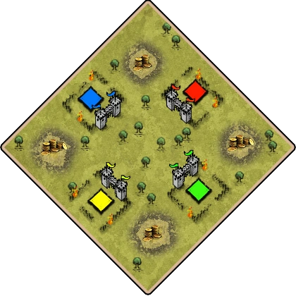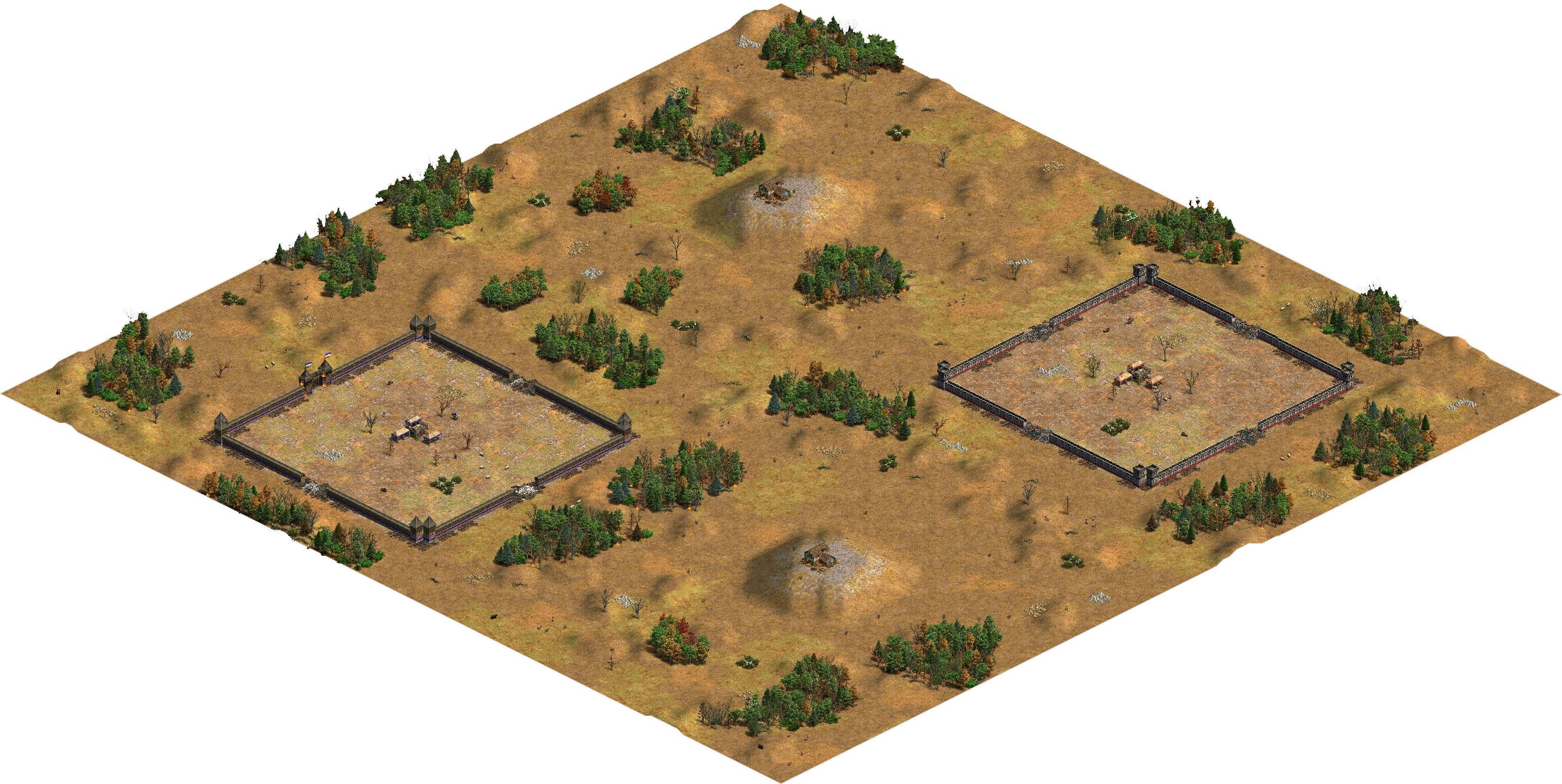 Aftermath surrounds each player with heavily damaged and collapsed Stone Walls, reminiscent of Arena or Fortress. Medium-sized forests dot the map, which have a unique (purely cosmetic) burning tree type. Starting resources are standard, though the stone deposits generate outside the walls, making them harder to defend. Between each player is a gaia-controlled Trade Workshop, which can be captured by a player who moves a unit close to it. Once captured, a Trade Workshop generates a trickle of 20 food, 20 wood, and 20 gold per minute, but it must be defended, as any enemy unit that moves close to it will convert it for that player.
