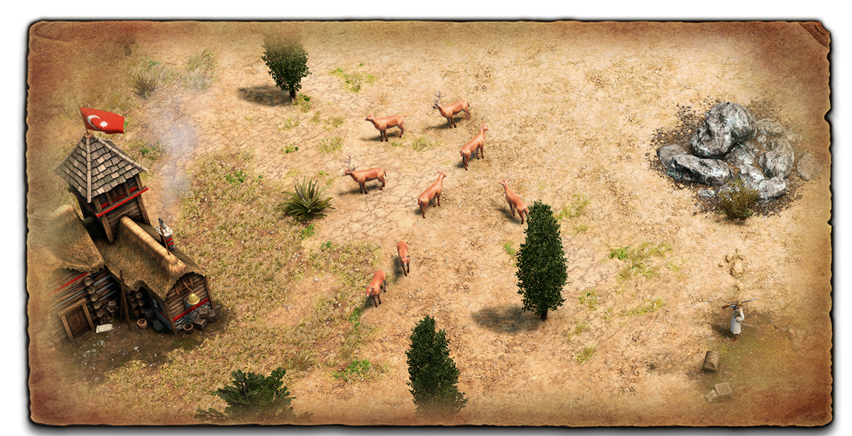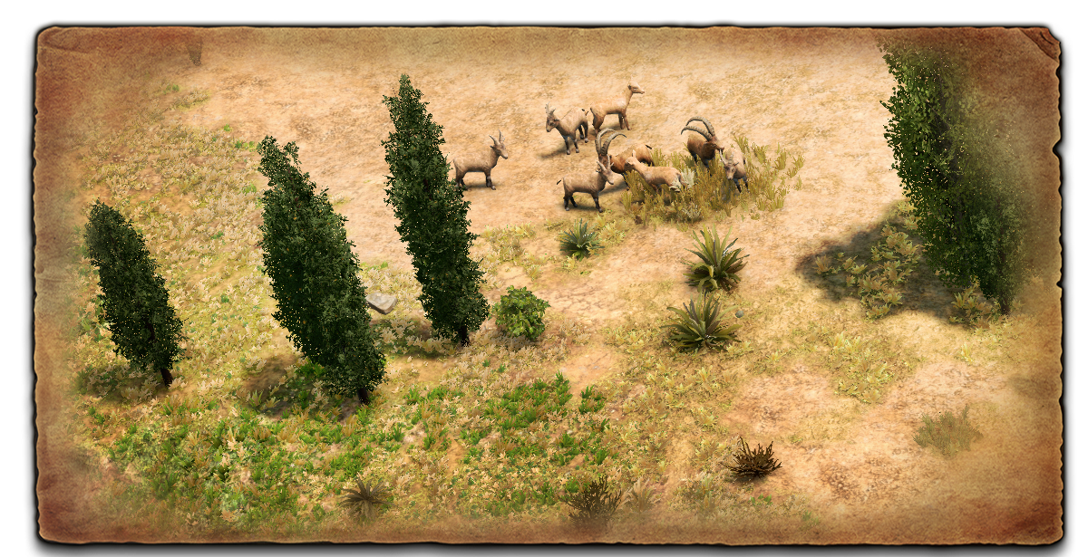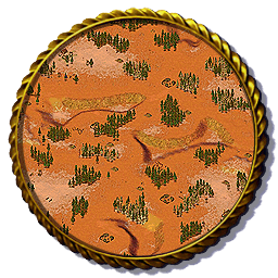 As mentioned, there are many cliffs and gorges throughout the central part of the map, where most of the Gold Mines and Relics can be found, but beware of Wolves. The environment itself is one of the most beautiful in the game, combining unique orange lighting (accessed in the Scenario Editor) with a landscape that harmoniously merges snow, sand and Palm Trees. In Retold, its appearance has changed significantly, being much more grassy, green, and snowy than before, with Cypresses (including the rare snowy variety) replacing the Palm Trees.