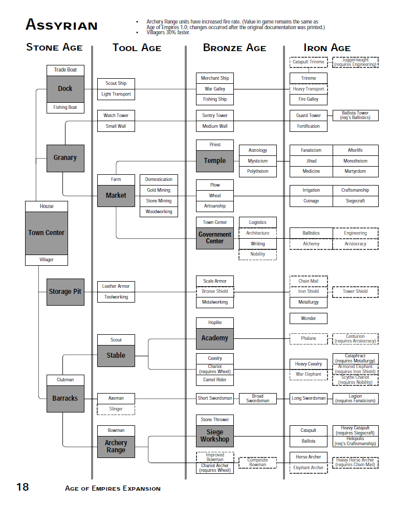 Technology tree of the Assyrian civilization in The Rise of Rome. Shaded boxes signify buildings, while Dotted Line boxes mean it is unavailable to this civilization. The vertical lines separate age availability, while the horizontal lines signify what is required to get an item.