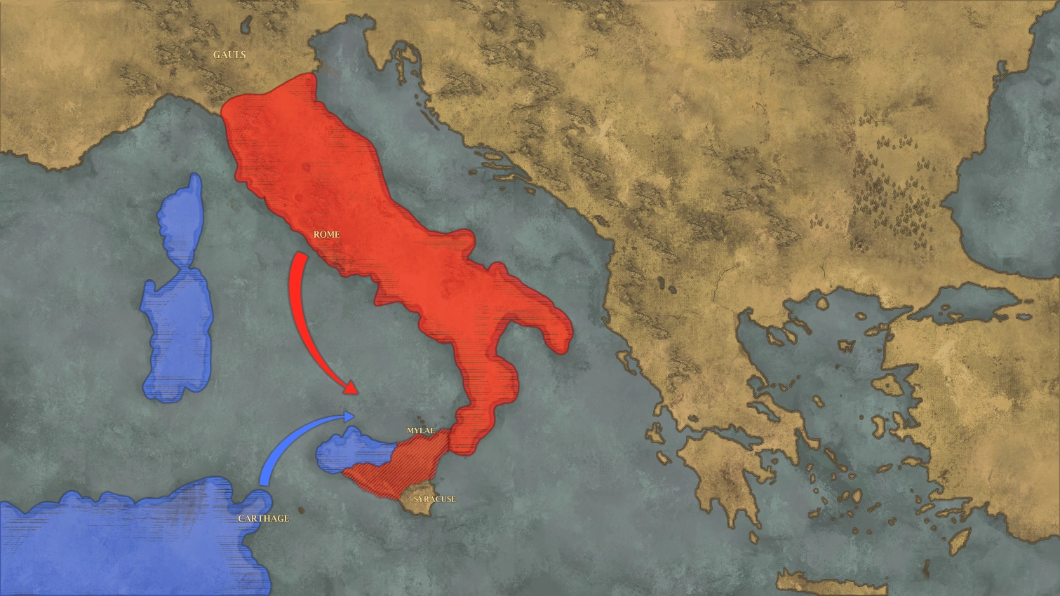 | “ | The Carthaginian monopoly of seapower in the Western Mediterranean greatly influenced the land battles for Sicily. The Romans recognized the need to engage the Carthaginians at sea, as well as on land. Copying the design of a wrecked Carthaginian warship, the Romans built a fleet of their own and sought a decisive naval battle. The Roman and Carthaginian fleets met near Mylae to decide who would control the sea. | ” |