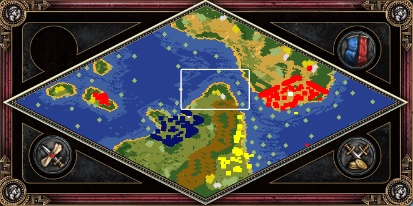 Romans): Rome starts with a Bronze Age base on the sprawling eastern landmass and can advance to the Iron Age. They have a large economy and send raids across the ocean, with warships coming ahead of transports loaded with a mixture of Barracks infantry, Bowmen, Priests, and Stone Throwers. One War Chest is to the east of their Temple. - Syracuse (