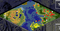 Romans): The Romans start with a Bronze Age base on the sprawling eastern landmass, and can advance to the Iron Age. They have a large economy, and send raids across the ocean, with warships coming ahead of transports loaded with a mixture of Barracks infantry, Bowmen, Priests, and Stone Throwers. One War Chest is to the east of their Temple. - Syracusans (