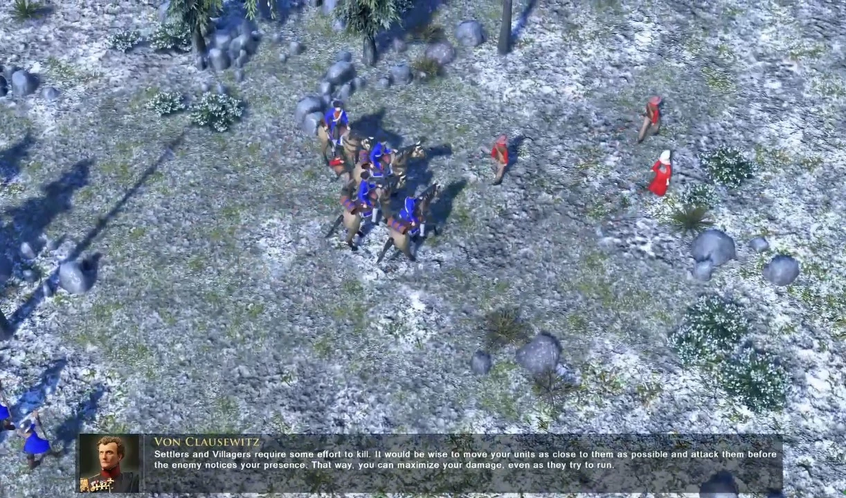 | “ | The enemy is building up its base undisturbed. This is not acceptable! One of your Settlers is building a forward Barracks in the center of the map so that you can train soldiers to rush the enemy. This is your town. You have all that you need to start to rushing the enemy. Be quick and kill some enemy Villagers before they can organize a defense! | ” |