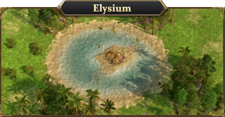 Elysium is a random map introduced in Age of Mythology: Retold. It is based on the afterlife of heroes and favored souls from Greek mythology. It is an open land map with ample amounts of all resources.