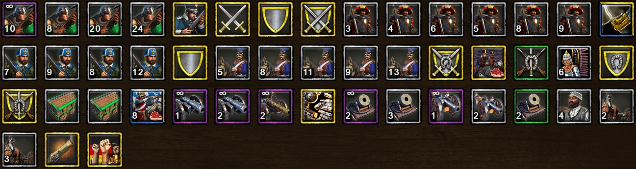 | Grenadiers available at the Artillery Foundry, Fort, and Galleon; Incendiary Grenades available at the Arsenal; Grenadiers use a hand mortar to attack, and get +2 Line of Sight and range; +3 Uhlans | N/A | ||
