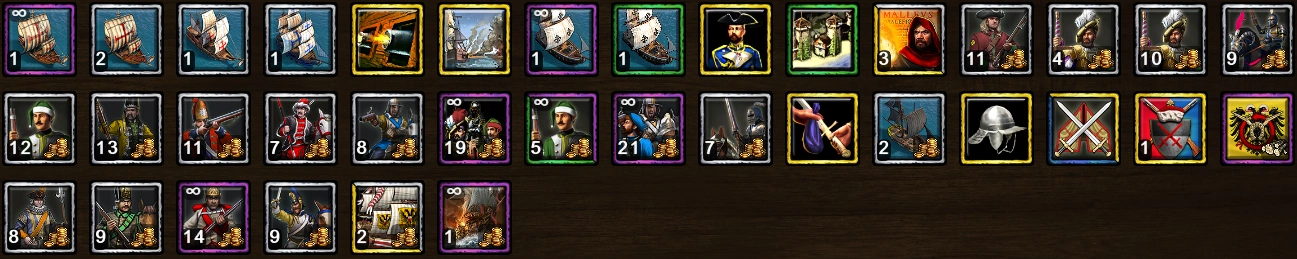 | Ships 4 Landsknechts; costs 250 coin | 1 | ||