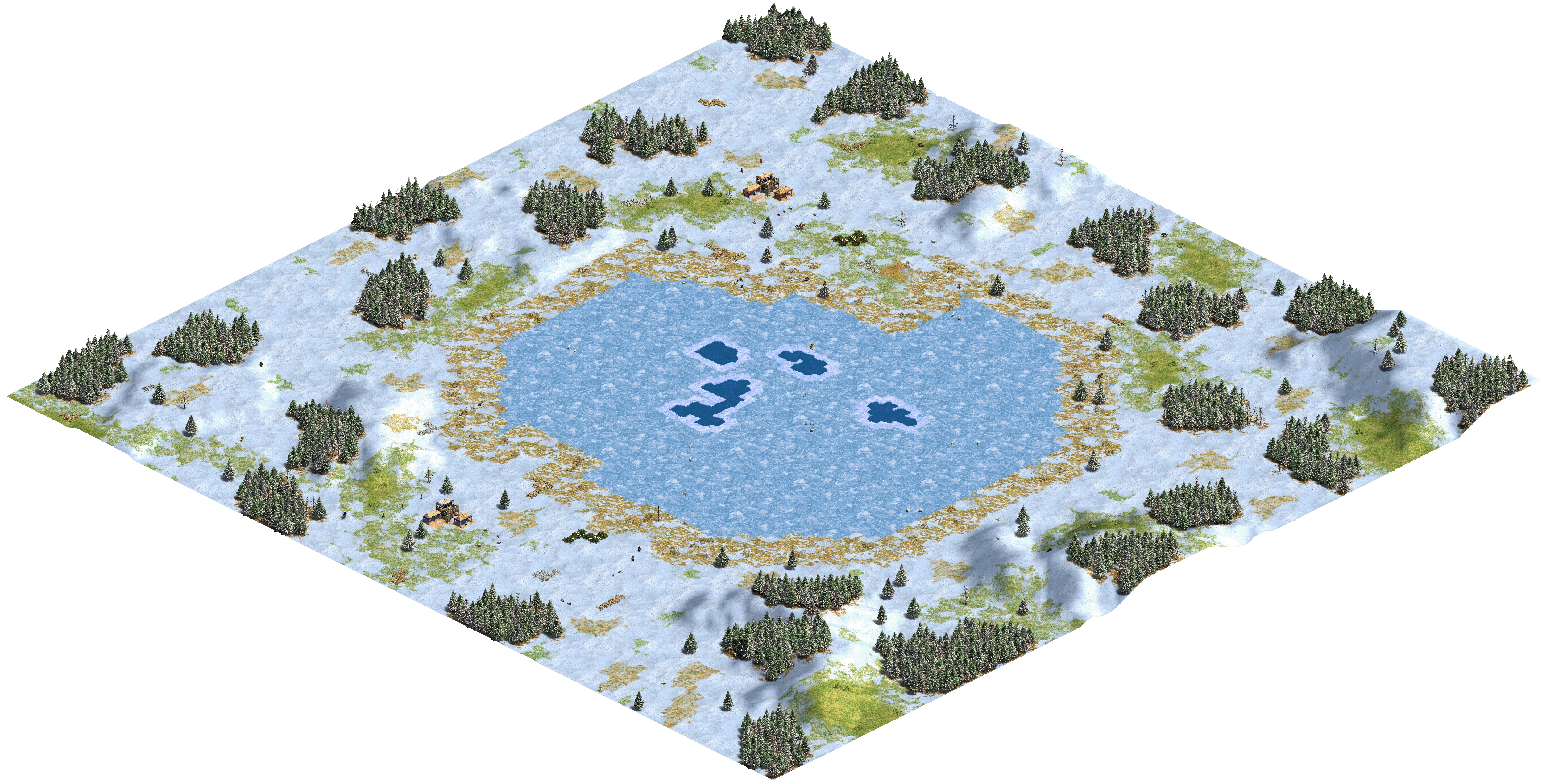 Start-up resources are the standard ones (6 Berry Bushes, 8 Sheep, 2 Wild Boars and normal piles of gold and stone), with the exception that the herd of Deer is fixed to 3 Deer. Resources along the map are low, since the central frozen lake occupies a big portion of the map (depriving this map of the typical wood, gold and stone glut in the center of the map). Gold and Stone are of relative abundance around the lake, Wood is scarce (however, there are lots of small tree lines around). However unlike most maps, a large number of Sheep can be found on the central lake, usually found in pairs, as well as small portions of water that may contain Shore Fish.