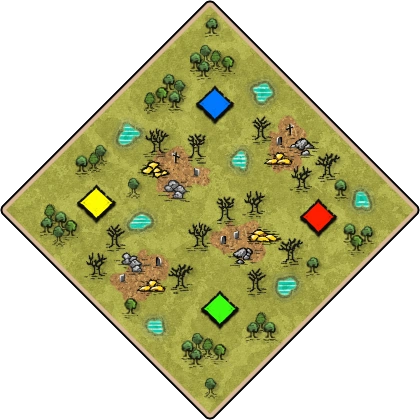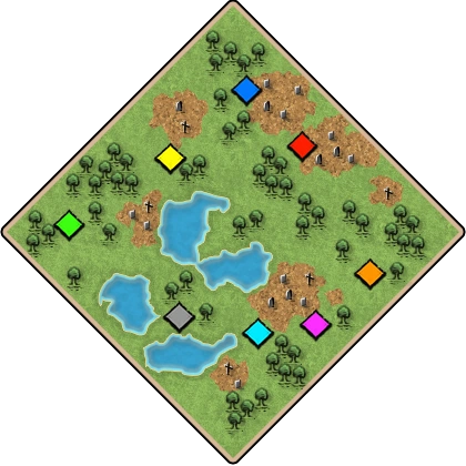 Graveyards is a modestly forested land map that features dead trees littered about haphazardly, as well as some lakes with fish, and the "graveyards" themselves being ever-prominent. These graveyards are large patches of dirt on hills littered with skeletons, gravestones, and the ruins of destroyed buildings. In these parts of the map, there are extra deposits of gold and stone, and extra Relics for the taking.