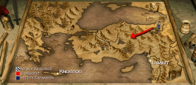 Hittites): The Player starts with a Town Center and some Villagers in the center of the map, close to the coast.
