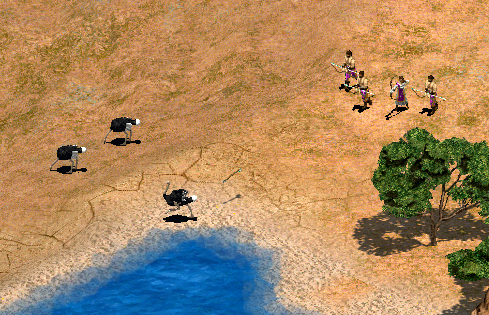 Each of the common huntable animals has an analogue in Age of Empires II, but they behave somewhat differently. Gazelles are analogous to Deer, but the latter return to their original location after fleeing. Elephants are analogous to Wild Boar, but the latter can outrun an un-upgraded Villager, whereas luring an Elephant requires the Villager to occasionally wait for the Elephant to catch up. Lions and Crocodiles are analogous to Wolves, but the latter don't yield food when hunted.