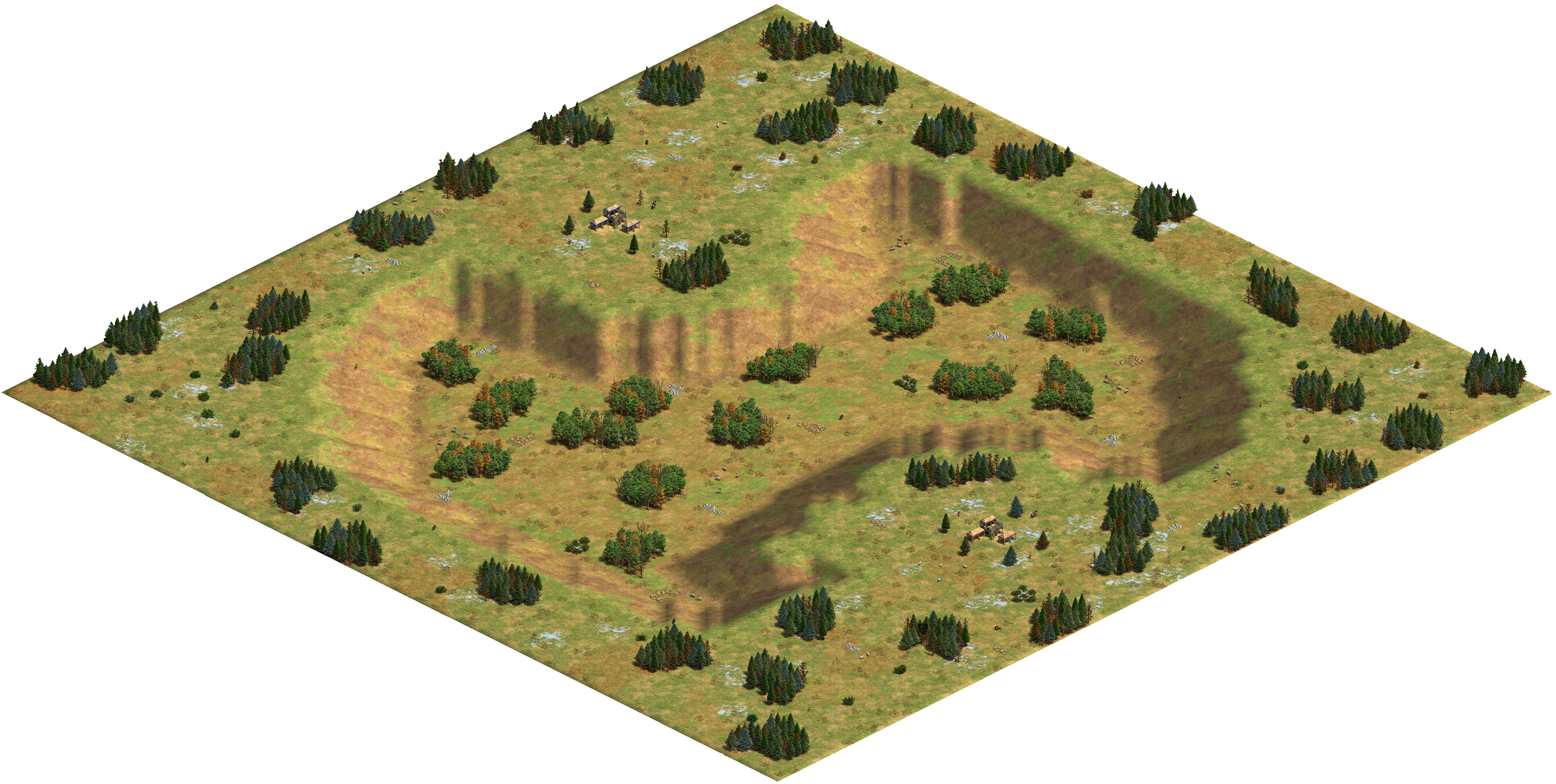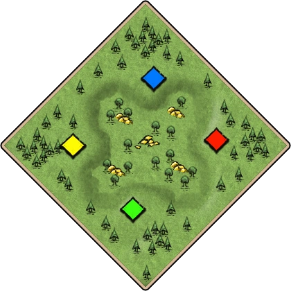 Gold and stone are limited outside of the lower central valley; players have only four tiles of each near their starting positions. In addition to the aggressive Bears that populate the map, players will have to deal with the difficulty of defending low elevations against other players. Relics generate throughout the map, showing no apparent preference for the upper or lower areas.