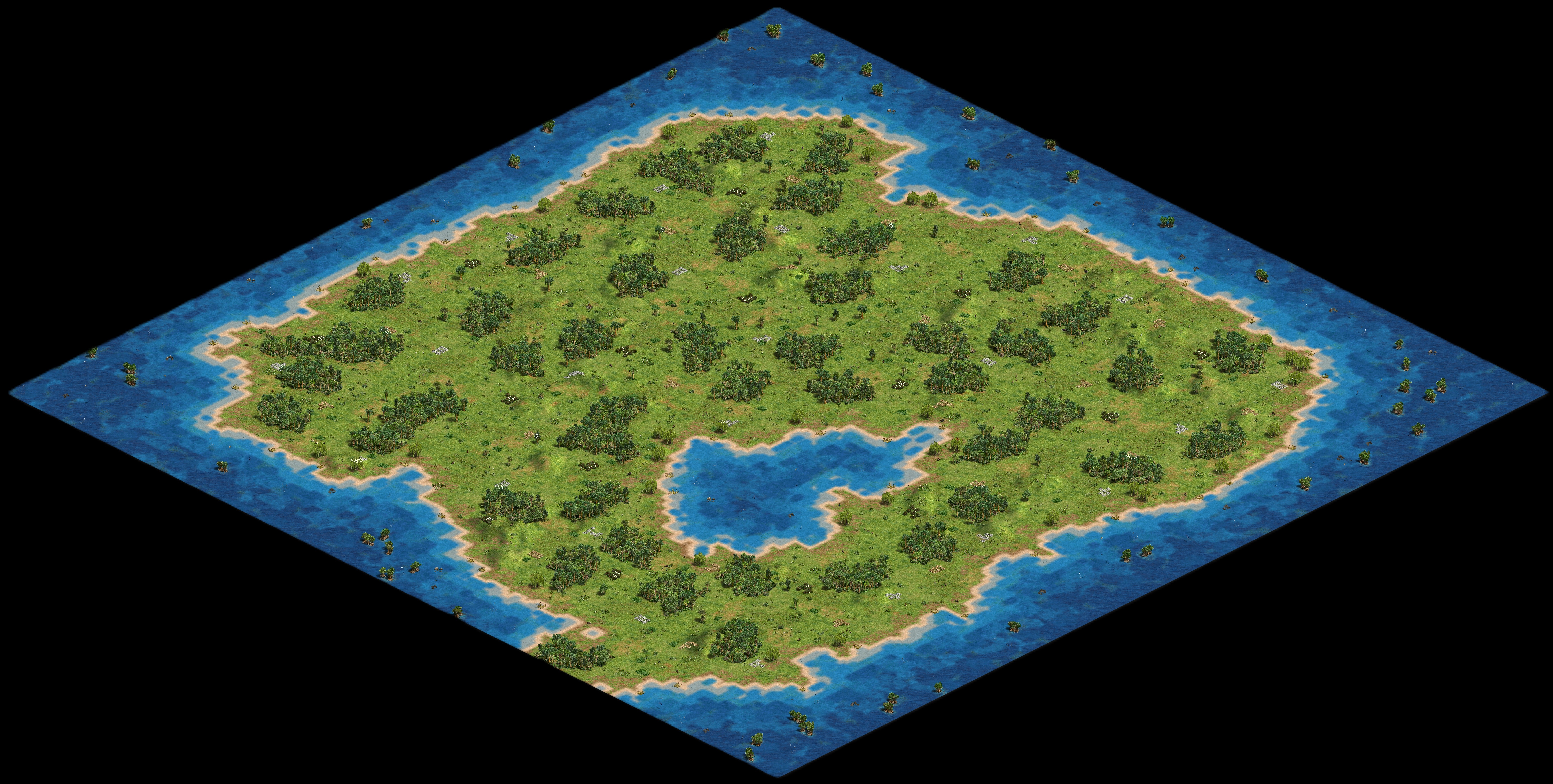 The map consists of a large landmass surrounded by water. Occasionally, lakes and rivers, and on larger maps, even a sea may be present in the center of the map. The land may feature temperate terrain with Pine Trees and grass, or desert terrain with Palm Trees and sand. Since players do not start at fixed positions like in other maps, resources like Wild Boars, Sheep, Berry Bushes, and herds of Deer appear scattered all around the map as well as the Gold and Stone Mines, and animals like Wolves are absent from the map. Relics are present in normal numbers. Hills of various elevations can be found across the land mass; however, cliffs are completely absent from the map.