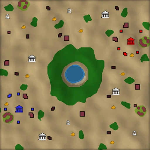 On this map, teams will spawn on opposite sides of the oasis, with players positioned along a circle with a radius extending approximately halfway between the trees and the edge of the map. The player or team that chops through the forest ring first will find themselves in a very advantageous position to win a Sacred Site victory, since the map's only two sites lie within the central area on opposite sides of the oasis, and any enemy ingress into this area will inherently be from a natural, easily defendable choke point created by a path through the trees. The central oasis area may also contain one of the map's Relics, which otherwise spawn in the standard amount, distributed around the map. The two Trade Posts may spawn anywhere along two of the opposing edges of the map, approximately equidistant from their respective opposite corners.