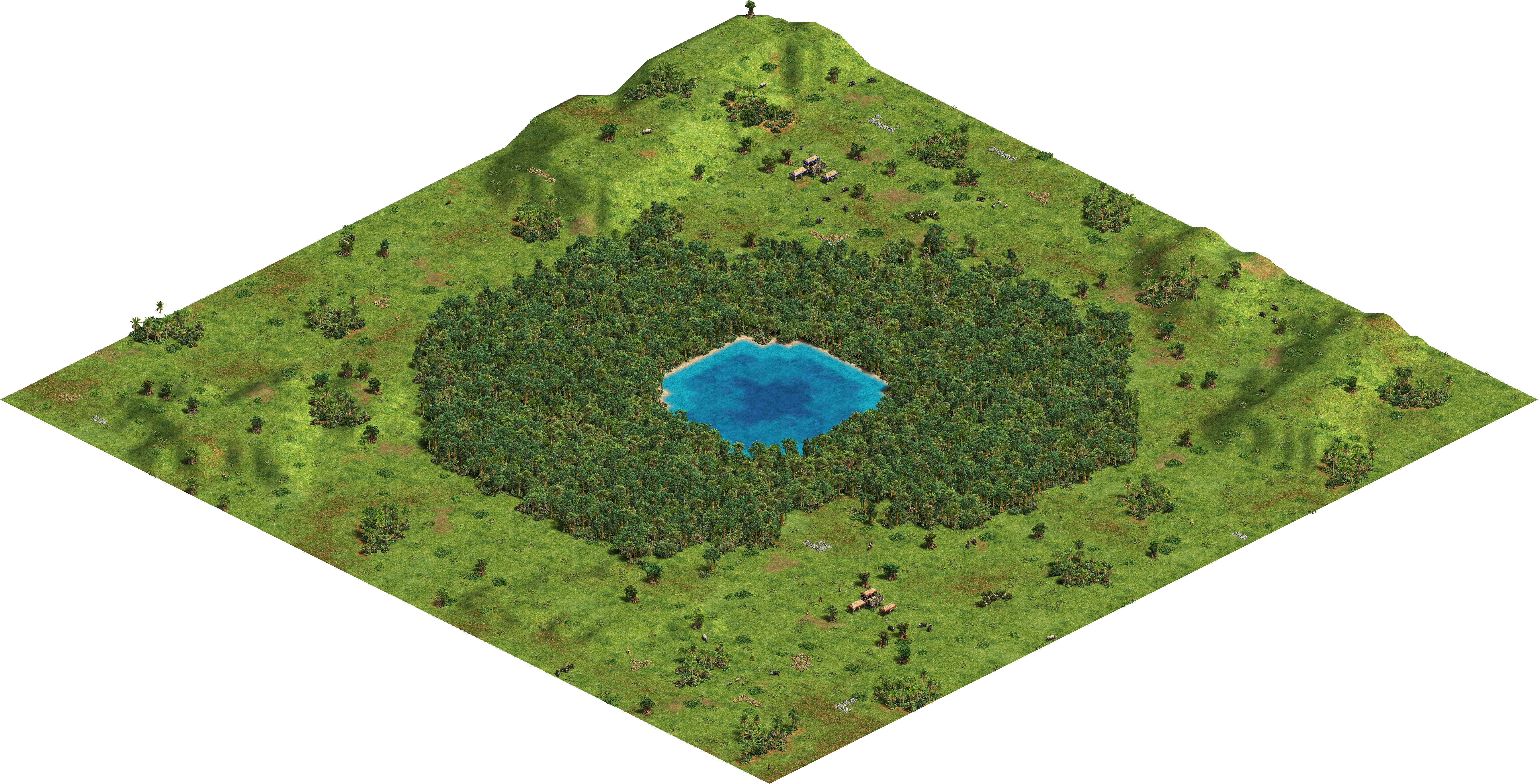 Start-up resources for each players are the standard ones (8 Sheep nearby, 2 Boars, 6 Berry Bushes, a herd of 3-4 Deer and normal piles of stone and gold); however, additional Sheep can be found in groups of three all around the map. Wild beasts can also be found, sometimes alone and sometimes in pairs, in regular numbers. The number of Relics is normal and varies with map size, and sometimes Relics are generated on the shores of the central lake. Gold and Stone Mines come in normal numbers evenly distributed along the map (except in the central forest). Hills are present in many sizes, and all outside the central forest; however, cliffs are absent and most of the map is flat.