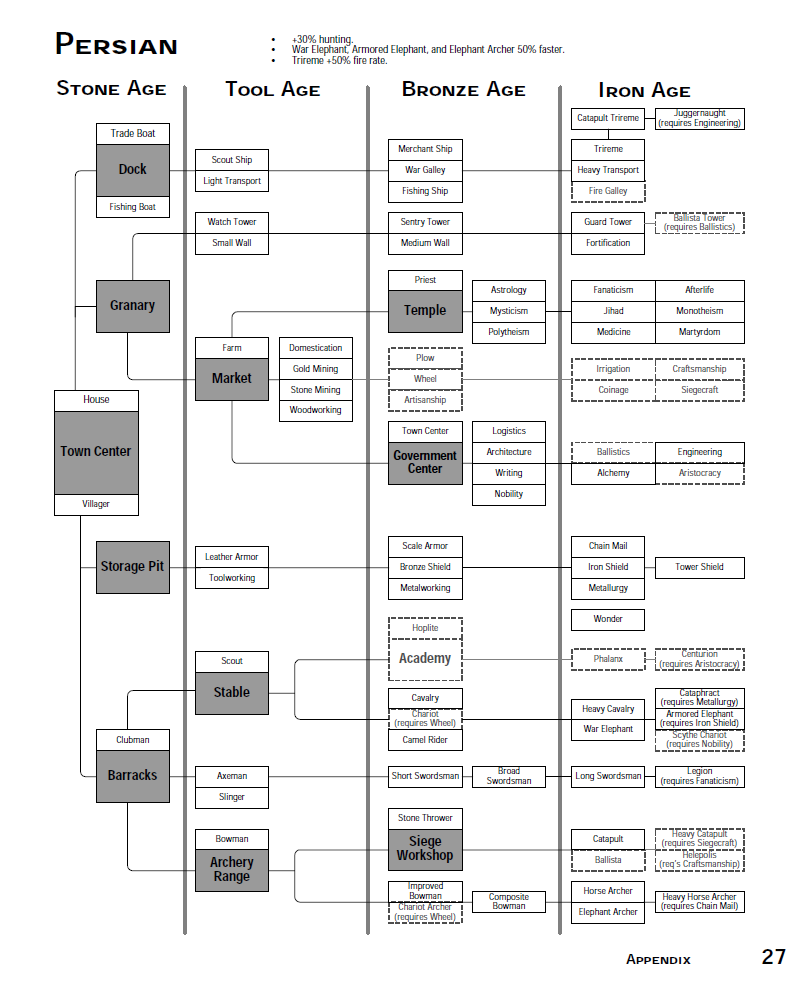 Technology tree of the Persian civilization in The Rise of Rome. Shaded boxes signify buildings, while Dotted Line boxes mean it is unavailable to this civilization. The vertical lines separate age availability, while the horizontal lines signify what is required to get an item.