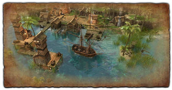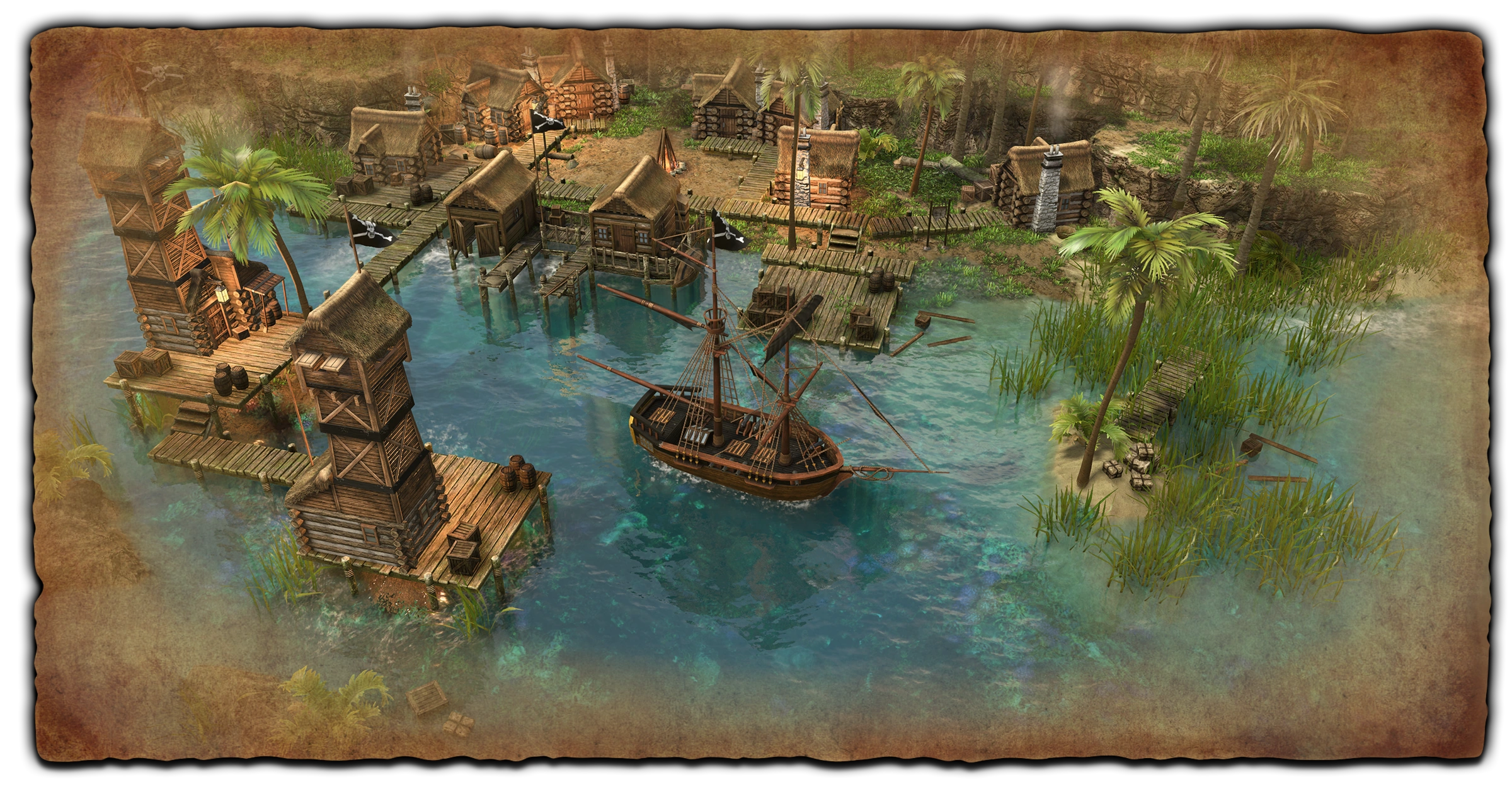British): The pirates have two bases with land units (Musketeers, Pirates, Comancheros, etc.) and ships (Privateers), and several are also hiding out across the various isles and islands. Many of them join the player when approached, turning over units, ships, and buildings including a Dock in each base and a Barracks in the southern one.