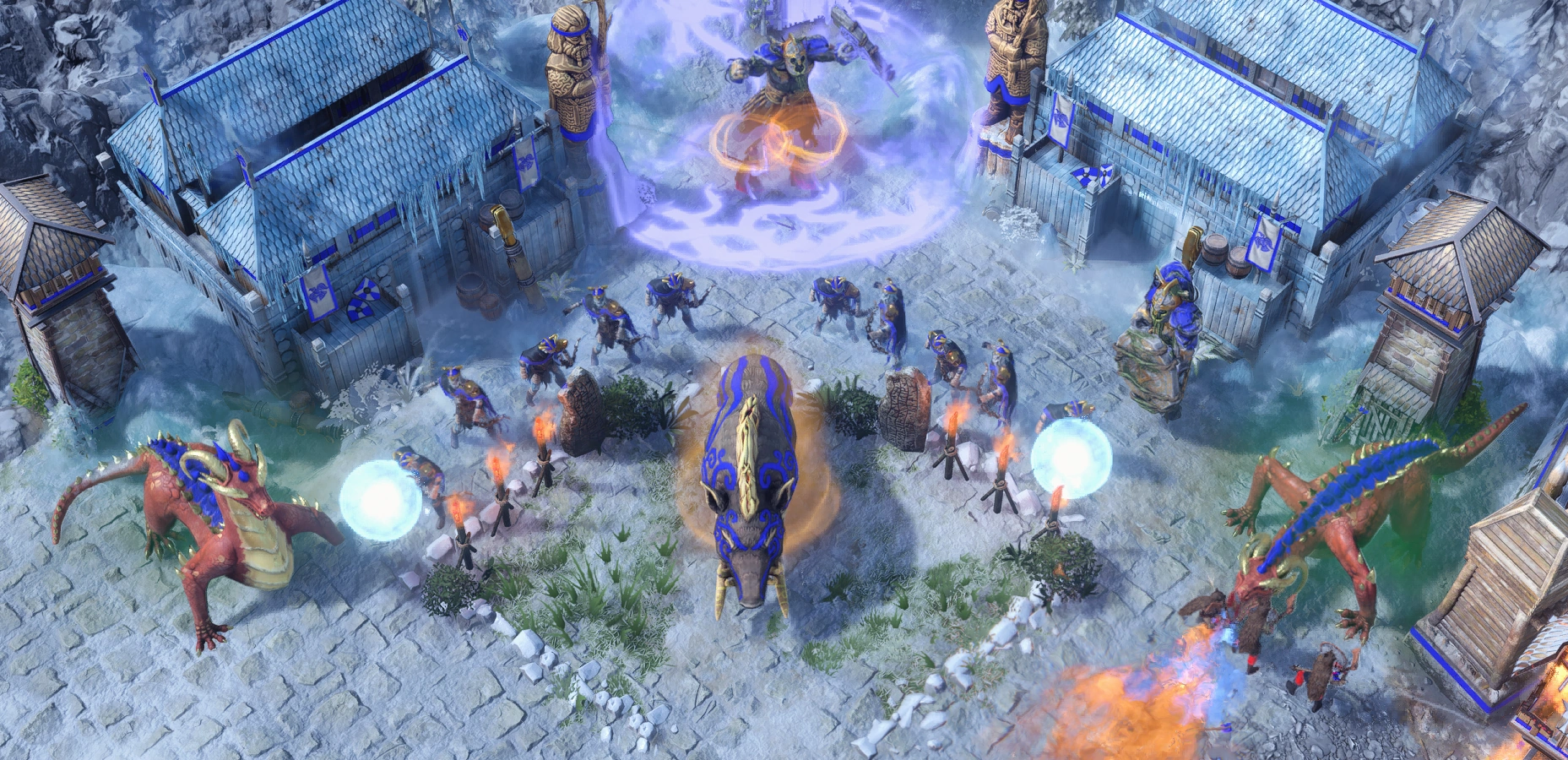 Loki): His base is in the snow-covered western parts of the map. They initially ignore the player due to their feuds with Halogi, but they eventually also start attacking with Frost Giants, Mountain Giants, and Throwing Axemen. - Halogi's Fire Giants (