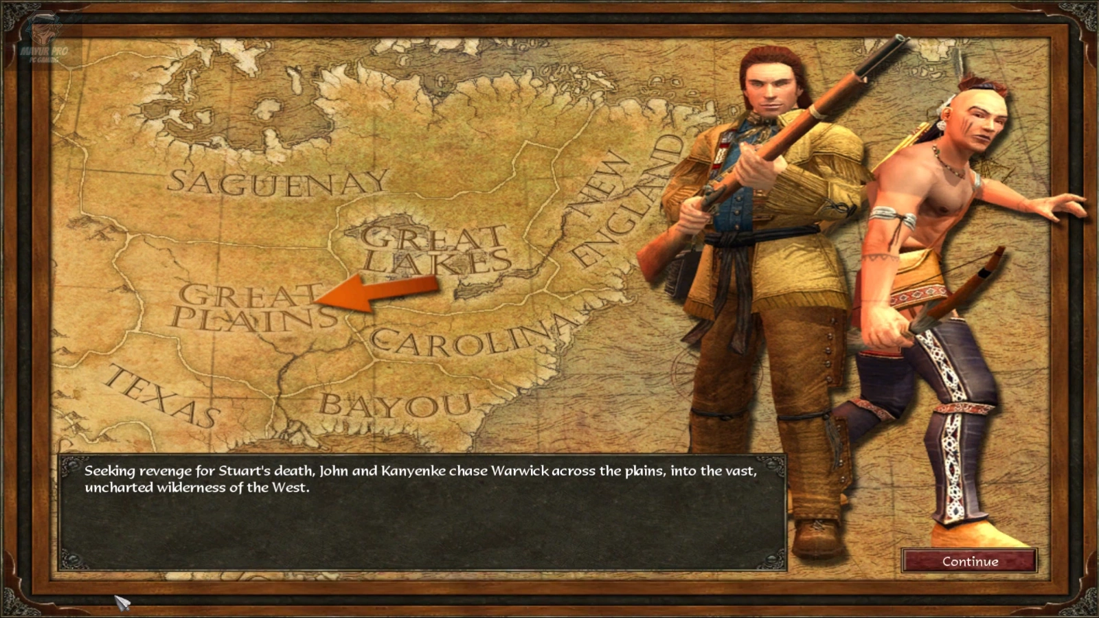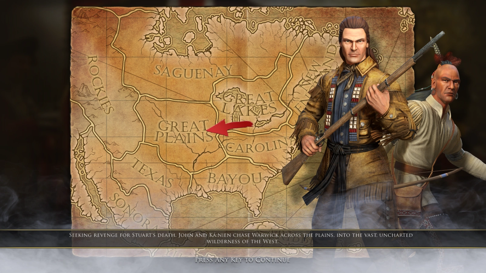 After finding Stuart's body, John orders Nonahkee to return to the village, while he and Ká:nien continue the journey towards the unexplored west, arriving at a large, flat and inhospitable area unknown to both: the Great Plains.
