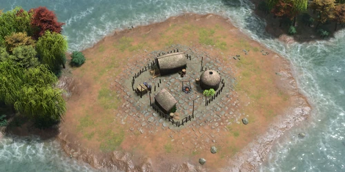 Starting hunt consists of Chickens and Green Pheasants, with other potential huntables including Deer, Spotted Deer, Serows, Crowned Cranes, and Monkeys. The shallow waters also contain fish (namely Herring). Japanese Wolves appear as predators, and Cows as herdables. Gold Mines appear on small islets scattered throughout the map, with additional Settlements and forests on the larger islands, while animals can be found both on land and in the shallows.