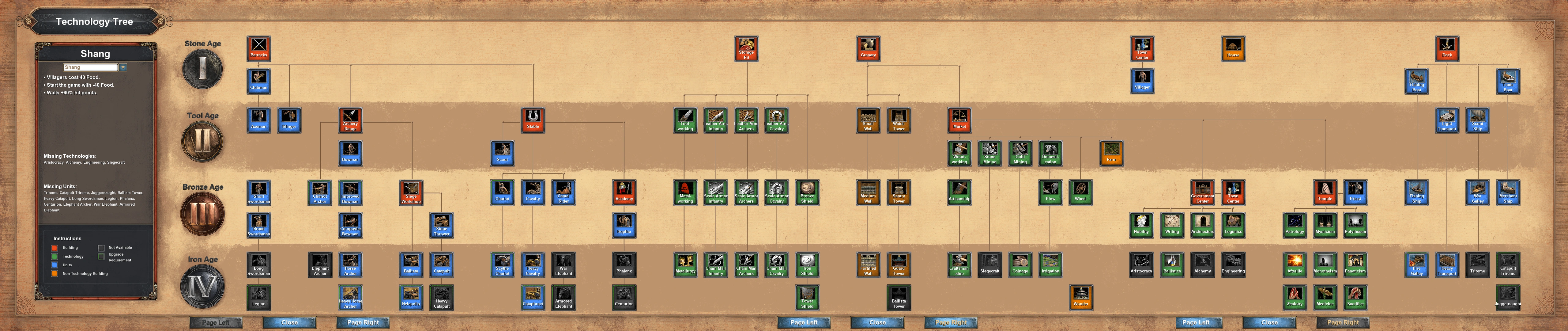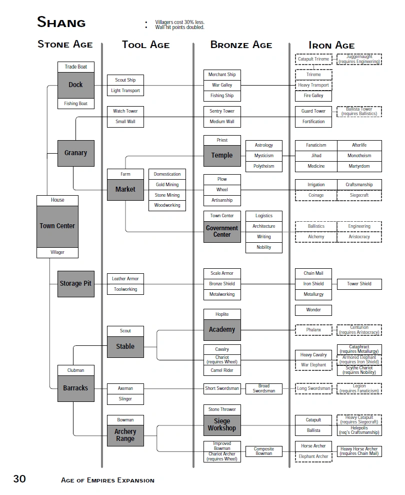 Technology tree of the Shang civilization in The Rise of Rome. Shaded boxes signify buildings, while Dotted Line boxes mean it is unavailable to this civilization. The vertical lines separate age availability, while the horizontal lines signify what is required to get an item.