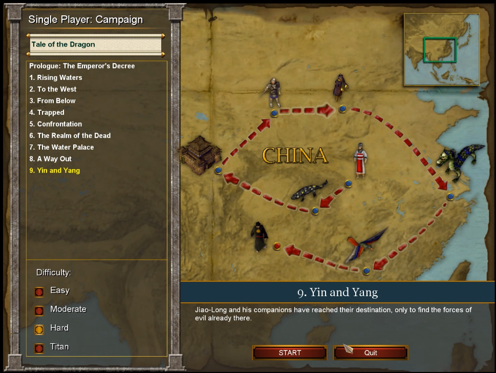 - Tale of the Dragon despite loosely being connected to the main campaigns, it has no relation in terms of characters, or story, with the only connection being (according to Cysion, one of the developers) that the events of The New Atlantis have caused the disturbance of Ying and Yang, however despite this connection, the main characters of The Tale of the Dragon never leave China, instead directly summoning the Titan, Pangu.