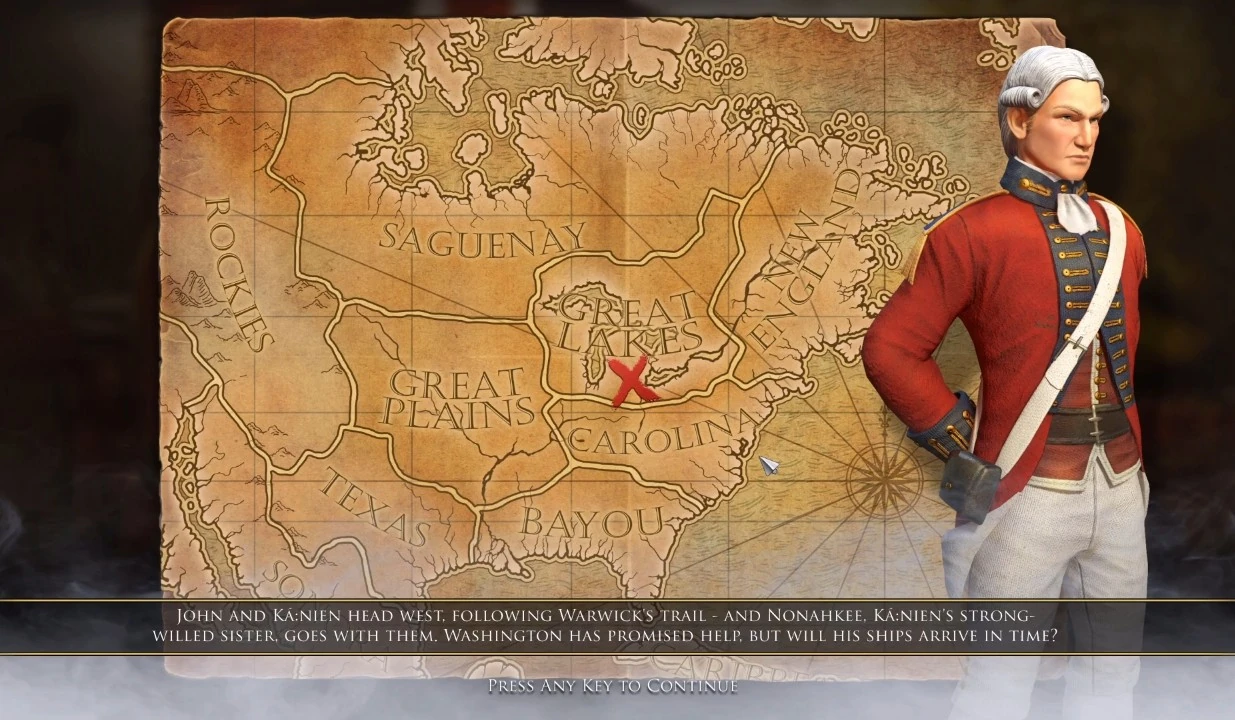 After their victory over Washington's British forces, John and Ká:nien ask Washington for help to continue the trail of the traitor Warwick and he offers them his ships, but it will take time for them to arrive, time of which John and Ká:nien don't have it, since they need to get to Warwick before the water from the destroyed Fountain of Youth is taken.