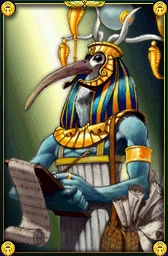 | “ | A patron of learning and invention, Thoth was the chief god of the city of Khmun and a divine scribe. He served as a loyal advocate and supporter of Osiris, defending him against charges by Set, helping Isis resurrect him as lord of the underworld, helping to keep Horus hidden from Set until the son reached adulthood, and then helping Horus regain his inheritance. Thoth then assisted Osiris by recording the past deeds of all who sought to enter the Underworld. He read the scales when the hearts of those seeking entrance were weighed versus the feather of truth. Thoth grew in importance as people sought his help in proving their innocence at judgment time. The priests of Thoth enhanced his reputation as a magician and claimed he had access to spells that gave him domination over the natural world and the gods themselves. Thoth is usually depicted with the head of an ibis or baboon. "Thereupon shall come Thoth, who is equipped with words of power in great abundance, and shall untie the fetters, even the fetters of the god Set which are over my mouth." -- From the Papyrus of Ani |
