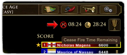 If enabled during game setup, Cease Fire will impose a 10 minute Treaty-like period at the start of the game that will prevent players from attacking other players. Players may still attack Treasure Guardians during this time, but they may not create Trading Posts on native sites without placing a foundation using a villager or explorer. (Limitations on building close to other players' Town Centers still apply as well.)