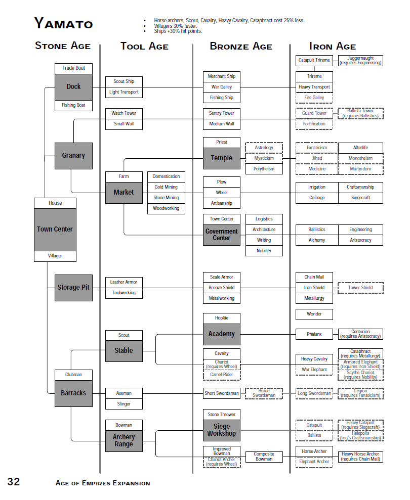 Technology tree of the Yamato civilization in The Rise of Rome. Shaded boxes signify buildings, while Dotted Line boxes mean it is unavailable to this civilization. The vertical lines separate age availability, while the horizontal lines signify what is required to get an item.